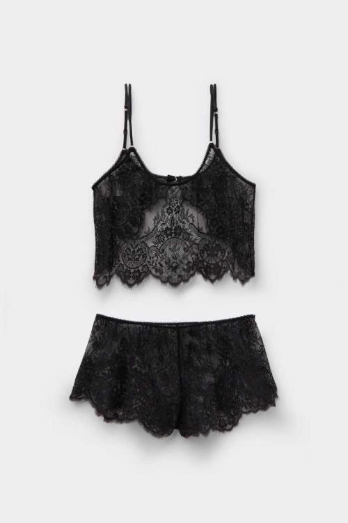 トップスとハイウエストキュロットのセットアップ。気品あるレースが、大人のバレンタインスタイルを演出します。