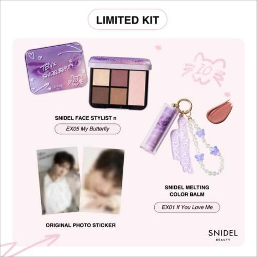 フェイススタイリストnEX05My ButterflyとメルティングカラーバームリミテッドキットTEX01IfYouLoveMeに加え、未公開カット2種のオリジナルフォトステッカーがセットになっています。