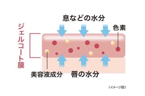 メロウラッピングルージュは、塗ってしばらくすると唇や息の水分と反応し、色素を取り込んだジェルコート膜を形成。色・ツヤ・うるおいを包み込み、つけたての仕上がりを守ります。