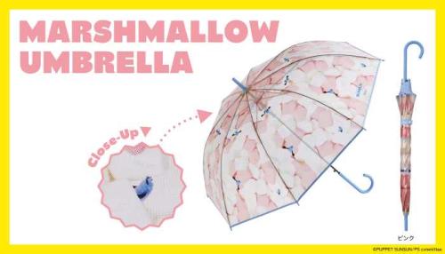 「パペットスンスン×Wpc.マシュマロアンブレラ」は、淡いピンクと白いマシュマロ、スンスンを描いたビニール傘。ブルーで統一された持ち手や石突きがアクセントです。