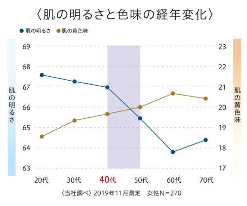 40代は肌の明るさが低下し、黄みが増えやすいターニングポイント。調査では、明るめファンデーションを選ぶ割合が2021年の29%から2025年には46%へ増加。