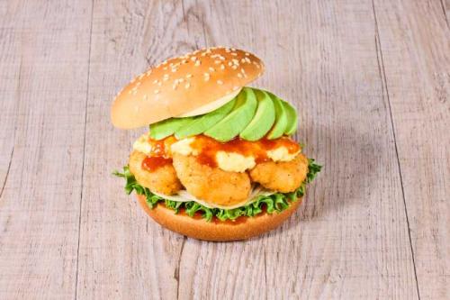 アボカドシュリンプバーガー~ホットソース~は、メキシコ産フレッシュアボカド1/2個とガーリックシュリンプ4尾をサンドした贅沢な一品。