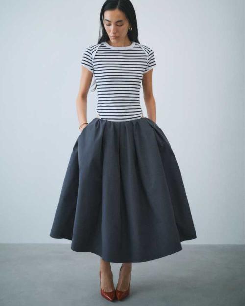 ドレスのように纏えるセットアップや存在感のあるアイテムは、シンプルながら個性を引き立ててくれます。