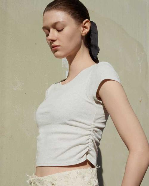 体にフィットするシルエットにサイドギャザーをプラス。さりげない肌見せとスタイルアップを両立し、着こなしやすい丈感も魅力です。