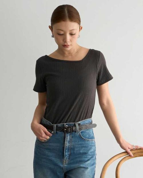 肩に少しかかるワイドネックで上品な肌見せを演出。リブ素材が程よい抜け感を生み、女性らしいシルエットを楽しめます。