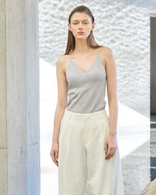 前後ともに細身ストラップを施した抜け感のあるキャミソール。シャーリング風の柔らかな生地が体にフィットし、深めのVネックでレイヤードスタイルにも活躍します。