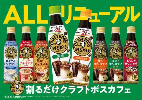 「割るだけクラフトボスカフェ」は、ミルクや水と割るだけでカフェのような味わいを楽しめる希釈タイプのドリンクシリーズ。