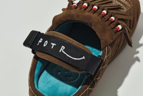 ネイティブアメリカンならではのフリンジやビーズ、そしてクラシックなウエスタンブーツに用いられるステッチを刺しゅうで表現し、ライナーとフットベッドにはPOTRを象徴するターコイズブルーを採用する。ヒールベルトは取り外し可能。