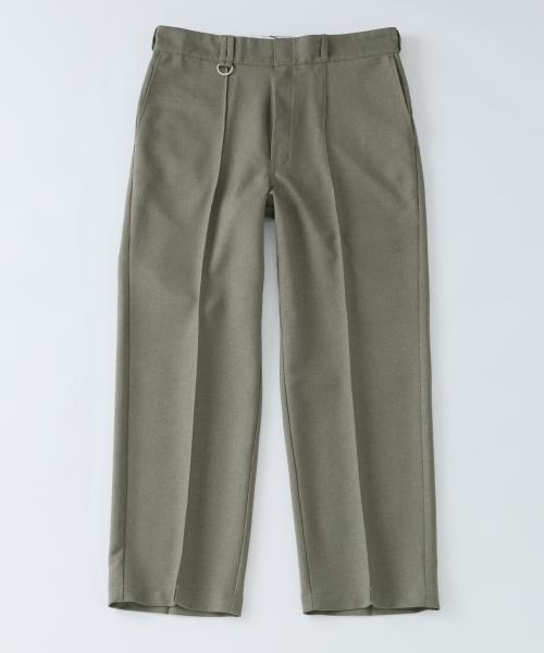 1980年代に出ていたモデルをリソースに、股上を深めに設定し、ストンと落ちるストレートシルエットに仕上げられています。ポリエステル素材の良さを活かすため、フロントにはピンタックを採用し、上品さを醸し出すセンタープレスで仕上げています。