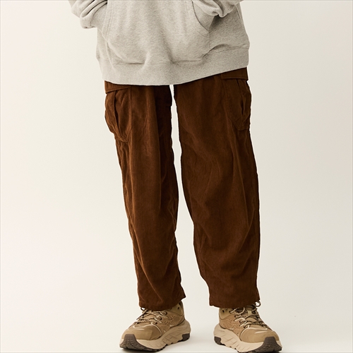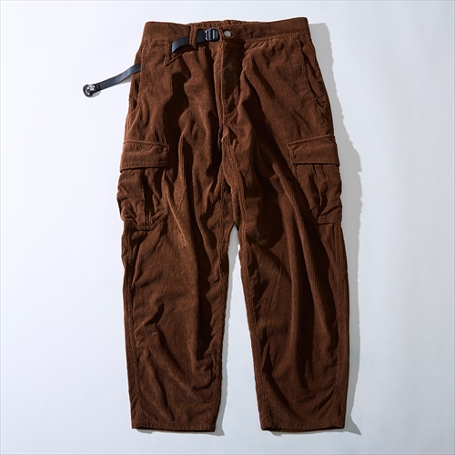 秋冬のコーディネートにウォーム感を与える、コーデュロイボディを用いたカーゴパンツ。ウェビングベルトとガゼットクロッチで快適性を追求。