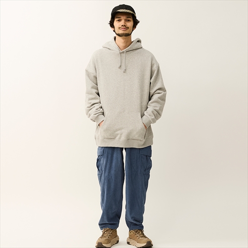 フードと身頃で配色を切り替えた、一枚で着てもサマになるスウェットパーカ。首元の保温性を高めるうえ、ハーフタイプのジップを開けるとベンチレーションに。