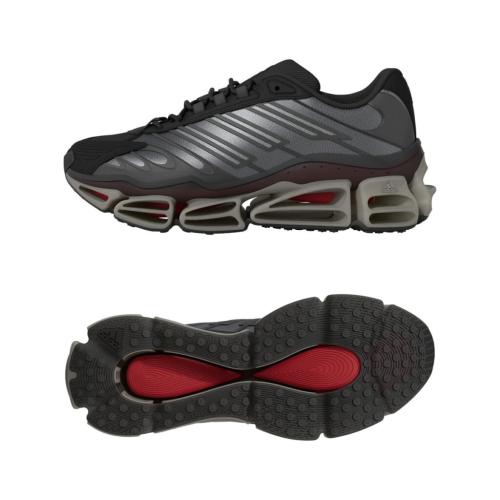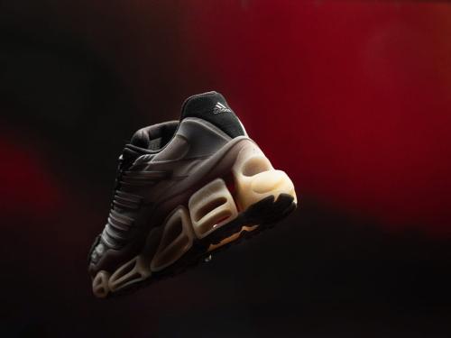 ブラックのモデルは、Megarideならではのクッショニングをベースに、シルバーのメタルメッシュと半透明 TPU オーバーレイを重ね、ソックライナーにダブル adidas ロゴ、トゥとヒールにリフレクター素材とスエードのアクセント、アウトソールは半透明のパテグレーに差し色のレッドが効いている。