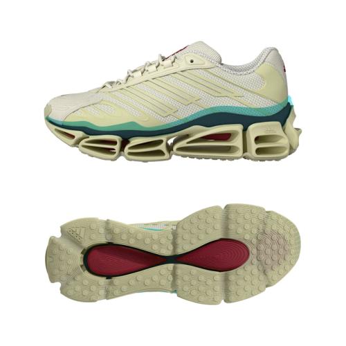 クリームのモデルでは、メッシュアッパーに半透明 TPU オーバーレイを重ね、ソックライナーにダブル adidas ロゴ、トゥとヒールにスエードのアクセントをあしらい、アウトソールにレッドの差し色を加えている。