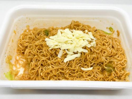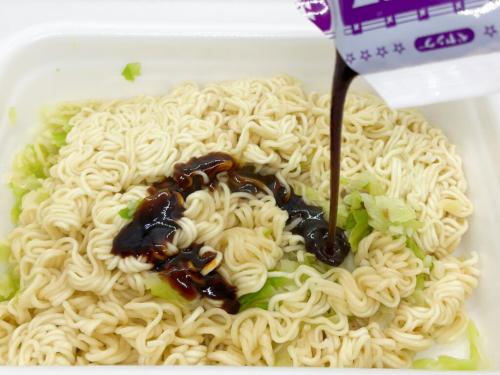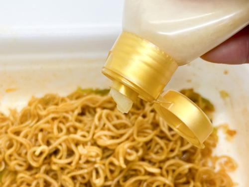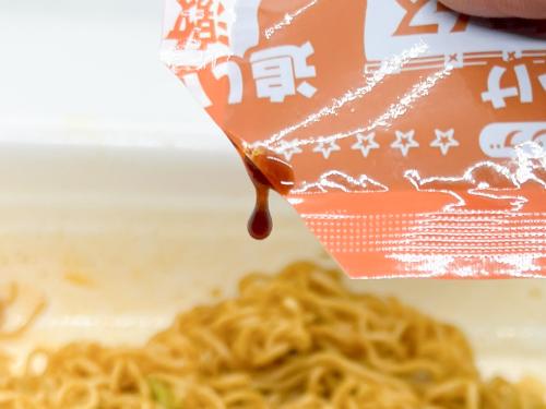 3分経ったら激辛ソースを麺の上へ。かけている間、すでにスパイシーで辛そうな香りが鼻を刺激します!