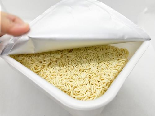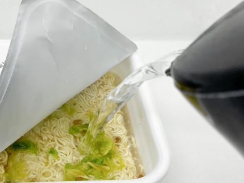 麺の上にかやくを開け、お湯を注いでいきます。お湯の使用目安は820mlだそうです。