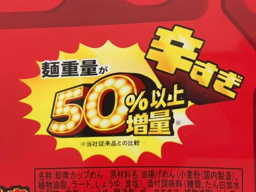 こちらがゲットしてきた『ペヤング 激辛やきそば 50%以上増量』。税込231円です。