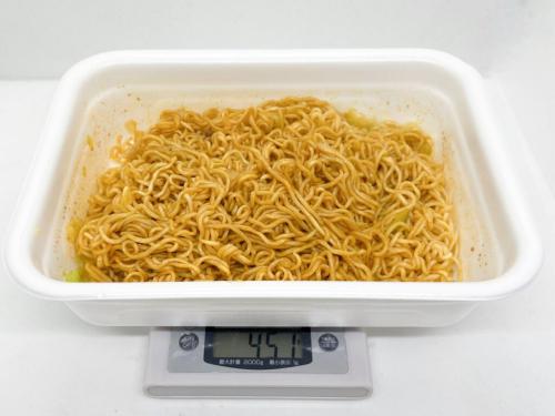 よく混ぜたら完成。焼きそばと容器で重さは451グラム!もうずっと辛そうな香りがぷんぷん漂って、食べるのが楽しみです。