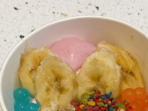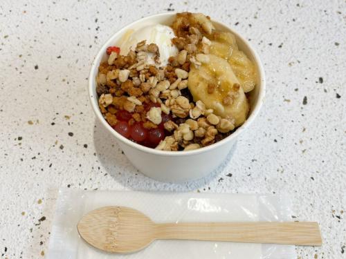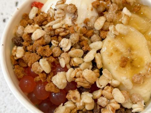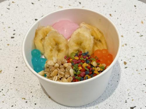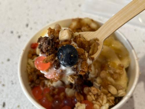 こちらが私が注文した『ヨーグルトアイス』(税込605円)。トッピングは『ブルーベリー』(税込550円)、『バナナ』(税込220円)、『ポッピングポバ/イチゴ』(税込220円)、『ロータスクランチ』(税込165円)『チョコグラノーラ』(税込165円)、『グラノーラ』(税込165円)をチョイス。さらにレジで『はちみつ』(税込330円)も追加。かなりモリモリになりました!