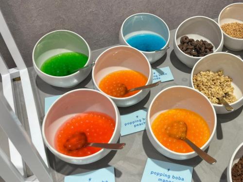 こちらの謎の『ポッピングポバ』は、簡単につぶすことができ、中からあま~いシロップが飛び出る仕掛け。弾ける食感がとても心地よかったです。