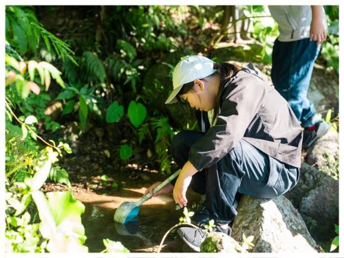 プログラムでは、砂浜や夜の森で生きものを探す自然観察が行われました。奄美ならではの自然に目を凝らして生きものを見つける時間は、図鑑で学ぶのとはまったく違う実感を伴います。また、「水の循環」をテーマに、山・川・海がどのようにつながっているのかを体感する学びも用意されました。雨が山に降り、川を流れ、海へとたどり着く。その流れの中で生きものや人の暮らしがどう関わっているのかを考える時間は、自然をひとつの大きなつながりとして捉えるきっかけになります。
