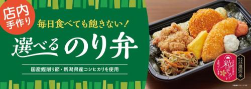 主食のごはんには新潟県産コシヒカリ「粒ぞろい」を使用し、のりの下には香り高い国産鰹の削り節を敷いています。全体の味のバランスは塩麹のきんぴらによって整えられ、のり・米・だしの絶妙な調和を追求しました。「選べるのり弁」は、毎日選べる価格と品質を両立し、食事の楽しさを提供します。まとめ