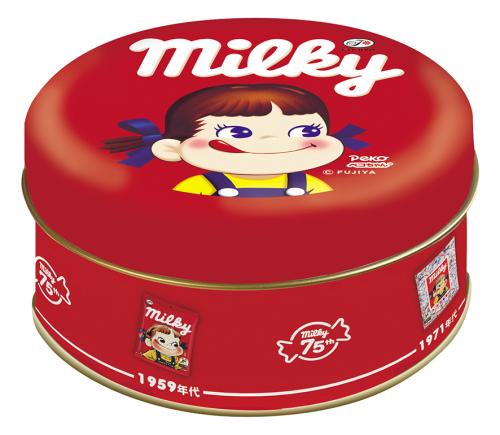 また、側面に歴代パッケージがデザインされた限定のミルキー缶が、2月25日より全国の不二家洋菓子店で発売中です。