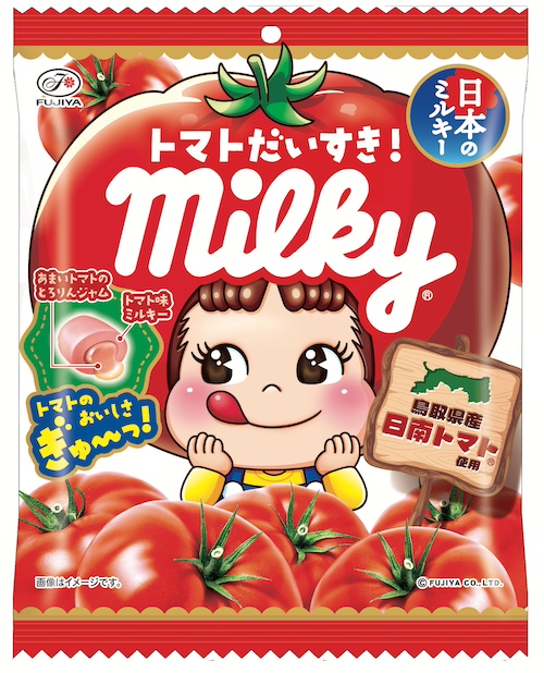 また、ミルキー発売75周年を記念し、鳥取県産のブランドトマトを使用した新商品「トマトだいすき!ミルキー袋」が3月3日より発売。