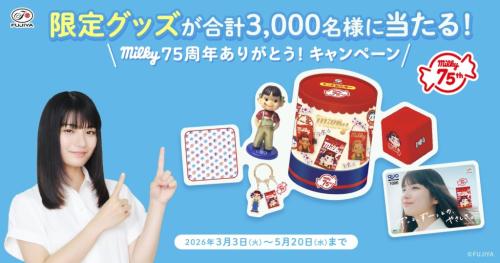 不二家は、対象商品を合計300円(税込)以上購入したレシートを1口とし、応募した方の中から抽選で合計3,000名に「75th記念!ミルキーBOX(限定レトロペコちゃん人形・3連アクリルチャーム・ハンドタオル・Bluetoothスピーカー)」または「蒔田彩珠さんオリジナルQUOカード1,000円分」が当たるキャンペーンを開催。