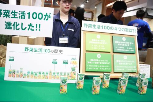 野菜生活100のブースでは、野菜生活のこれまでの軌跡や、新しく使用されているニュージーランド産のにんじんを使用していることなどを説明。