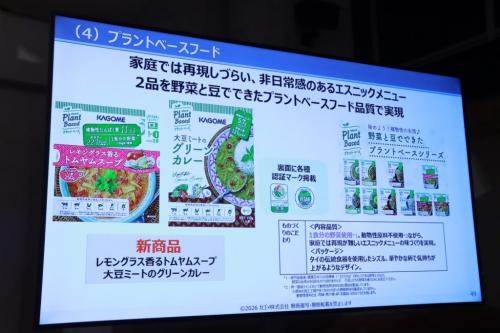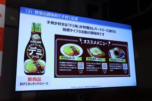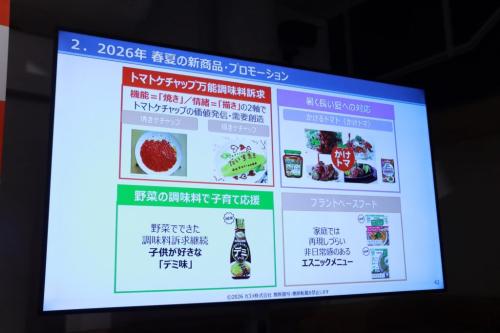 新商品としては、かけるだけで子どもが喜ぶデミグラスソース「かけてかんたん デミソース」や、プラントベースフードからエスニックメニュー2品を発売することも明かしました。
