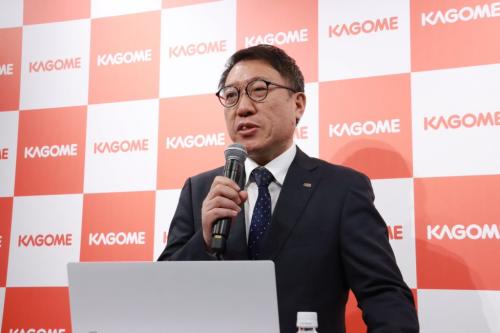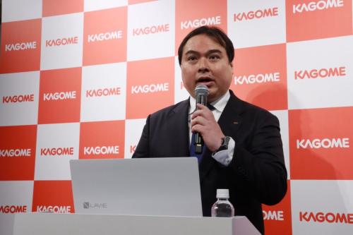新商品発表会の第1部では、カゴメ株式会社 マーケティング本部 飲料企画部の藤澤昭典部長が登壇し、飲料商材について紹介しました。