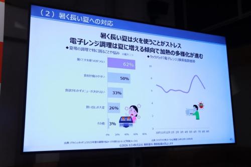 また、トマトケチャップやソースの需要拡大などのほか、現代では調理の簡便さを重視する傾向が加速し、もはや火を一切使わない「コンロキャンセル界隈」などもトレンドとなりつつあると説明し、かけるだけ・レンジ調理だけでアレンジができる商品を主軸に展開すると説明しました。