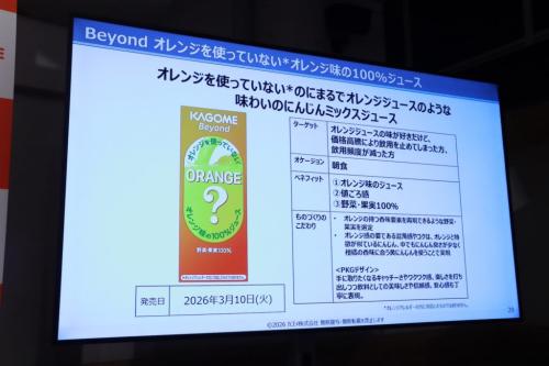 また、カゴメは昨今のオレンジの高騰を受け、新商品としてオレンジ果汁を一切使用していないにも関わらず、見た目から味わいまでオレンジジュースのような野菜・果汁100%ジュース「Beyond オレンジを使っていないオレンジ味の100%ジュース」を発表。