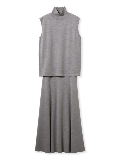 「ハイネックノースリニット×ナロースカートSET」は、リニューアル記念限定アイテム。ふわっとしていて軽く、少し起毛感のある糸で編み立てたノースリーブトップスと、ナローシルエットのスカートのセットアイテム。トップスはノースリーブで軽い着心地ながら、秋を感じさせる風合いで編立てています。スカートはしっかりとしたリブの編み地で、フレア過ぎないスッキリとしたシルエットがポイント! ルミネ有楽町店では、シックな印象で秋へのシーズンシフトにぴったりのライトグレーを限定カラーとして用意。
