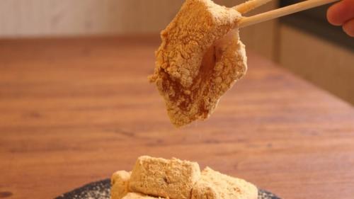 「生わらびもち」では、山菜ワラビの根部分10kgからわずか70gしか採れない、貴重な本わらび粉を使用。材料の配合や炊き方など試行錯誤を重ね、究極のやわらかさを追及した結果、とろとろ食感が生まれたのだそう。たっぷりとまぶした砂糖不使用の香ばしいきな粉と一緒に食べるのが醍醐味!