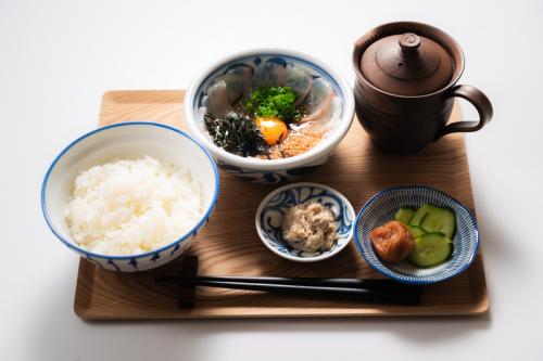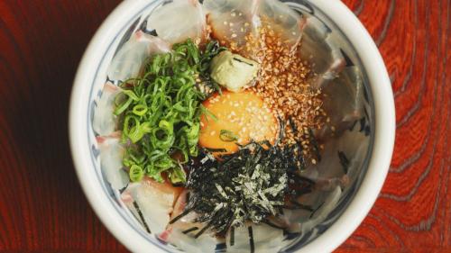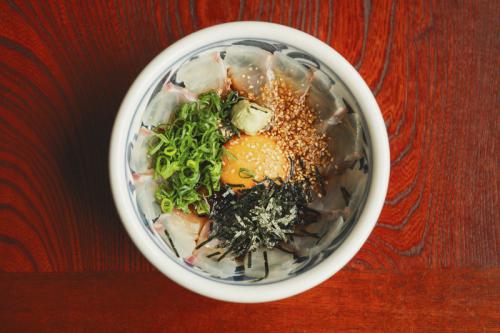 看板メニューは「紅坂の鯛めし白寿」。熟成した「白寿真鯛0」の刺身に、農家直送の国産こしひかりと純国産鶏の卵を合わせた特製鯛めし。1杯目はお刺身で、2杯目は鯛出汁を注ぎ、3杯目は鯛味噌を添えて締める、と3度楽しめるのが魅力。
