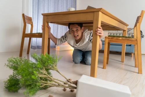 「ぐらっと揺れた!」という状況を想定し、机の下に避難する練習をしてみましょう。キッチンタイマーで3分など設定し、鳴ったら一斉に机の下にもぐるというルールで試すのもおすすめ。「この場所にぶつかりそう」「みんなで入ると結構狭い」など、実際にやってみることで気づくことがありそうです。