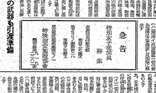 <急告・特別女子従業員募集>と題し、業務内容の説明はない。<衣食住及高給支給>と条件のみ記載されている。