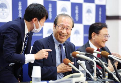 大学で仕事を片付けていた午後5時半に吉報を受けた。「最近、勧誘の電話がよくかかってくる。またかと思ったら(スウェーデン王立科学)アカデミーの選考委員長を名乗ったのでびっくりした」「非常にうれしいのですが、(歴代受賞者の)皆さんがどう応えていたのかなという思いがよぎった」などと関西弁で語り笑いを誘った。その上で「感謝の気持ちと、報われたんだな」とほっとした様子で話した。