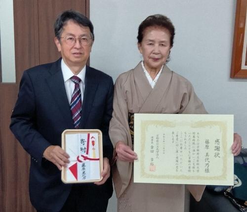 寄付したのは同市内の主婦、藤原美代乃(みよの)さん(86)。50歳のころC型肝炎が判明して同院で治療を受け、5年ほどで完治。その後も同院で定期検査を受けている。2020年にも500万円を寄付しているが、「長生きして、もう一度寄付できるよう頑張りたい」と話した。