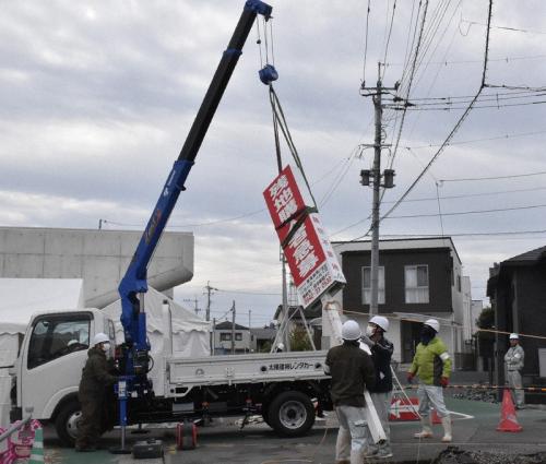撤去作業は12日午前10時過ぎから始まり、看板の根元部分を切断し、クレーンでつり上げ荷台に載せた。代執行にかかった約50万円は元地権者に請求するという。高架化はJR久大線の踏切渋滞緩和などが目的で、高架部分の供用開始は27年3月を見込む。