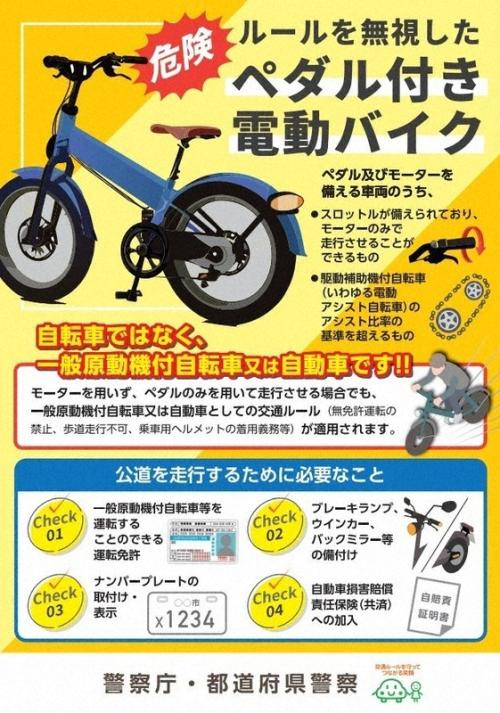 モペットは昨年11月施行の改正道路交通法で、モーターを使わずペダルだけで走行する場合も「一般原動機付自転車」または「自動車」の運転にあたる運用に厳格化された。電動アシスト自転車と見分けにくいが、いわゆる原付バイクに分類される。