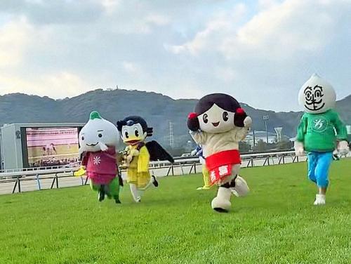 北九州市と近隣市町のマスコットキャラクターが俊足を競い合う「自治体対抗! ご当地キャラダービー」が1日、北九州市小倉南区の小倉競馬場芝コースであった。15体が「出走」し、冬の小倉競馬さながらの熱のこもったレースを展開した。