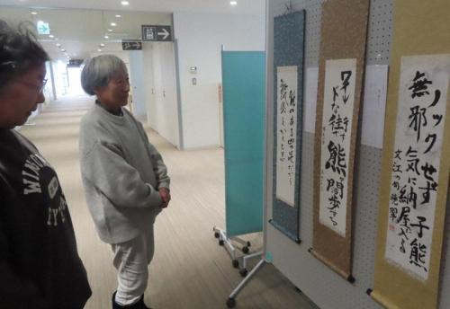 2025年に大量出没したツキノワグマをテーマにした川柳書展「~クマとの対峙(たいじ)の中で~ 暮(くら)しと野生動物を考える」が12日まで、秋田市役所の2階廊下で開かれている。市街地での出没に不安な日々を過ごした市民らの思いが込められており、主催関係者は「生活に密着した表現である川柳の奥深さを改めて知ってほしい」としている。