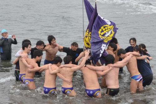 会場となった北条海岸付近のこの日午前11時現在の気温は7度で水温は13・5度。水泳部員17人とOB5人は伝統の「天突き体操」で体を温めた後、波の穏やかさから「鏡ケ浦」の別名を持つ館山湾へ。約10分間冬の海を泳ぎ、円陣を組んで校歌を熱唱した。