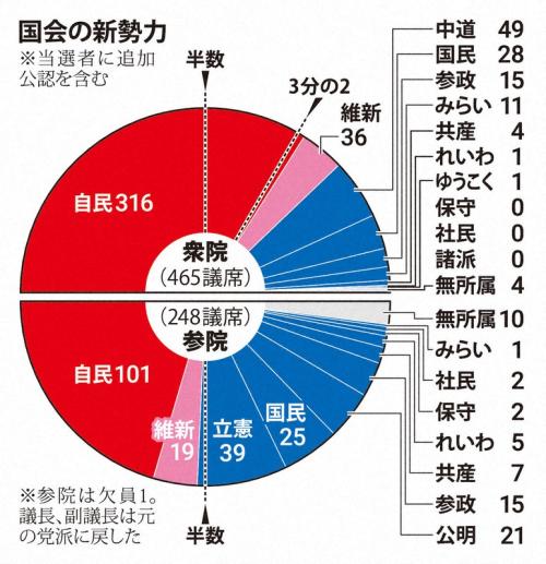 A 自民は316議席を獲得し、単独で衆院の3分の2である310議席を超えました。単一政党の戦後最多記録を更新しました。それまでは、旧民主党が2009年の衆院選で得た308議席が最多でした。連立を組む日本維新の会と合わせた与党で衆院の4分の3を占めます。