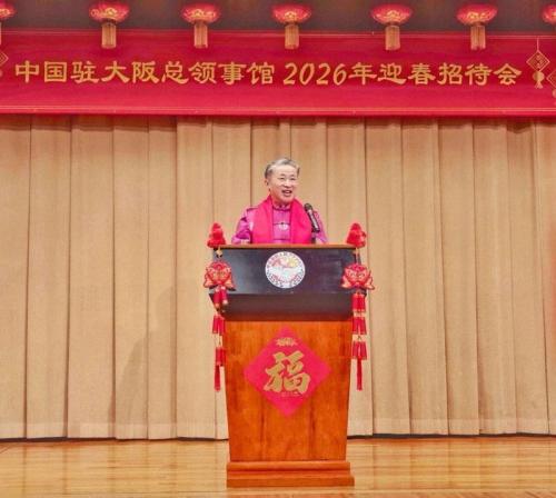 大阪市にある在大阪中国総領事館が10日、春節歓迎会を開き、薛剣(せつけん)総領事があいさつした。薛氏は2025年11月、台湾有事を巡る高市早苗首相の国会答弁に「汚い首は斬ってやる」とX(ツイッター)に投稿し物議を醸したが、投稿以来、薛氏の公の場での姿が伝えられるのは初めてとみられる。