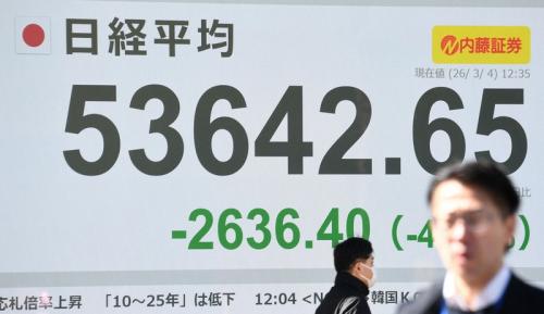4日の東京株式市場の日経平均株価(225種)は3日連続で大幅下落し、終値は前日比2033円51銭安の5万4245円54銭だった。下げ幅は米景気後退懸念から急落した2024年8月2日に次ぐ過去5番目の大きさで、2日からの3日間では計4600円超(約8%)。イランを巡る中東情勢の混乱が拡大・長期化することへの懸念から欧米やアジアの主要株価指数も値下がりし、世界同時株安の様相を呈している。