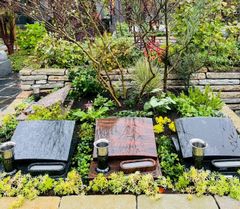 日本人の心に優しく寄り添う和モダンなテイストの樹木葬です。当社のガーデンデザイナーが、紅葉を中心に、和と洋の樹木と花をうまく組み合わせて植栽しました。