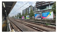 「原宿ファッションジョイボード」は、JR原宿駅ホーム前にある13面の大型ボード(各タテ3m、ヨコ4m)です。